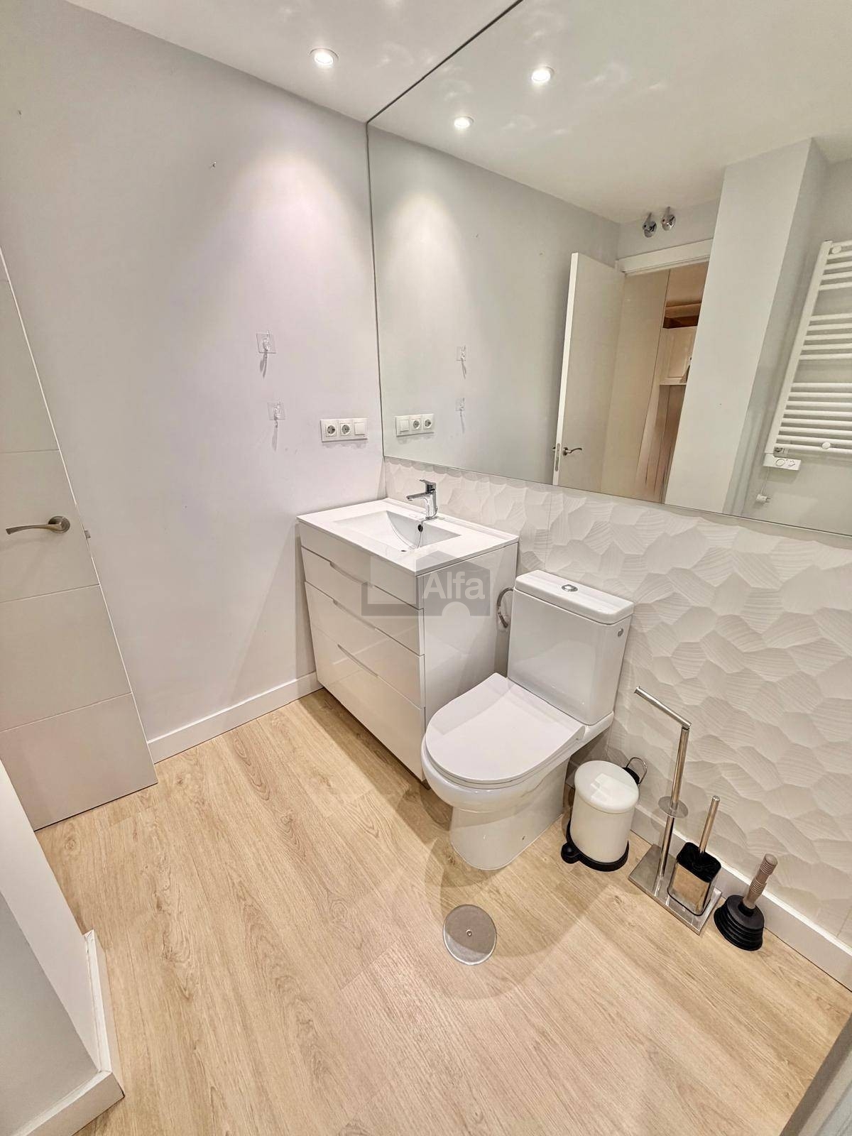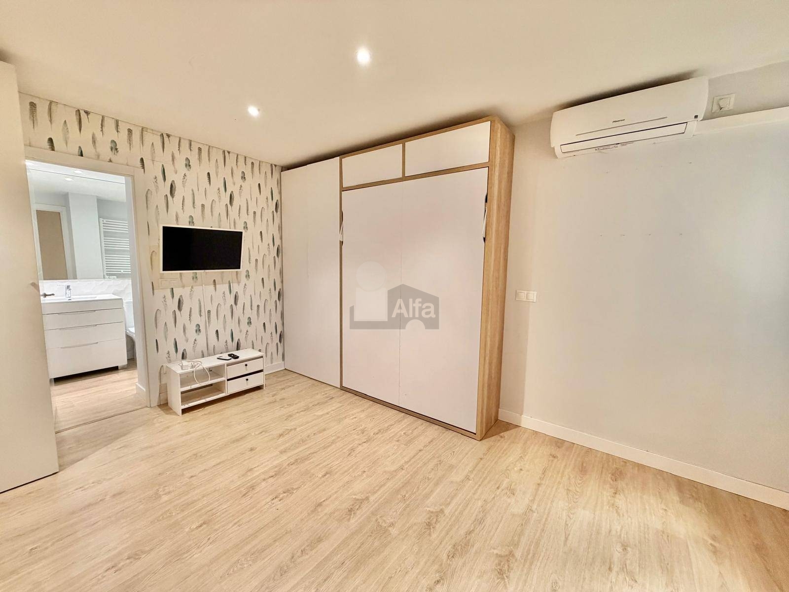 - Iluminación LED empotrada y suelos de madera clara que aportan calidez.